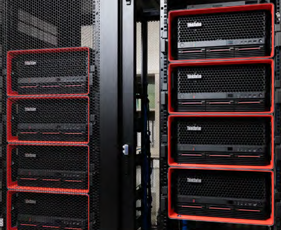 AI 駆動型統合データ解析システムを構成するITインフラの調達は、2024年7月に競争入札によって行われました。この結果、導入が決まったのが、8台の「Lenovo ThinkStation PX」です。1筐体あたりGPUを3基(NVIDIA RTX 5000 Ada 32GB)搭載したラックマウント可能なワークステーションで、合計24基のGPUクラスターを構成することで、大規模なデータ分析のワークロードにも柔軟に対応します。