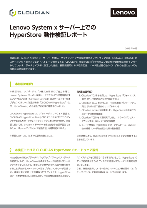 クラウディアン(株)様と共同実施したLenovo System x上でのCLOUDIAN HyperStore®動作検証レポートです。SSD含む高速アクセス仕様の検証構成は、オブジェクトストレージ導入をご検討のお客様にとって価値ある結果が得られています。(12P構成)