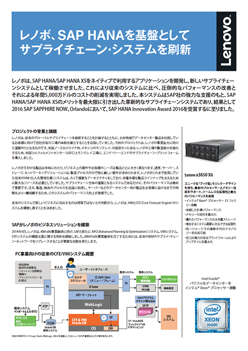 レノボは、SAP HANA/SAP HANA XSをネイティブで利用するアプリケーションを開発し、新しいサプライチェーンシステムとして稼働させました。これにより従来のシステムに比べ、圧倒的なパフォーマンスの改善とそれによる年間5,000万ドルのコストの削減を実現しました。本システムはSAP社の強力な支援のもと、SAP HANA/SAP HANA XSのメリットを最大限に引き出した革新的なサプライチェーンシステムであり、結果として2016 SAP SAPPHIRE NOW、Orlandoにおいて、SAP HANA Innovation Award 2016を受賞するに至りました。(4P構成)