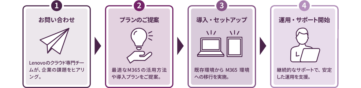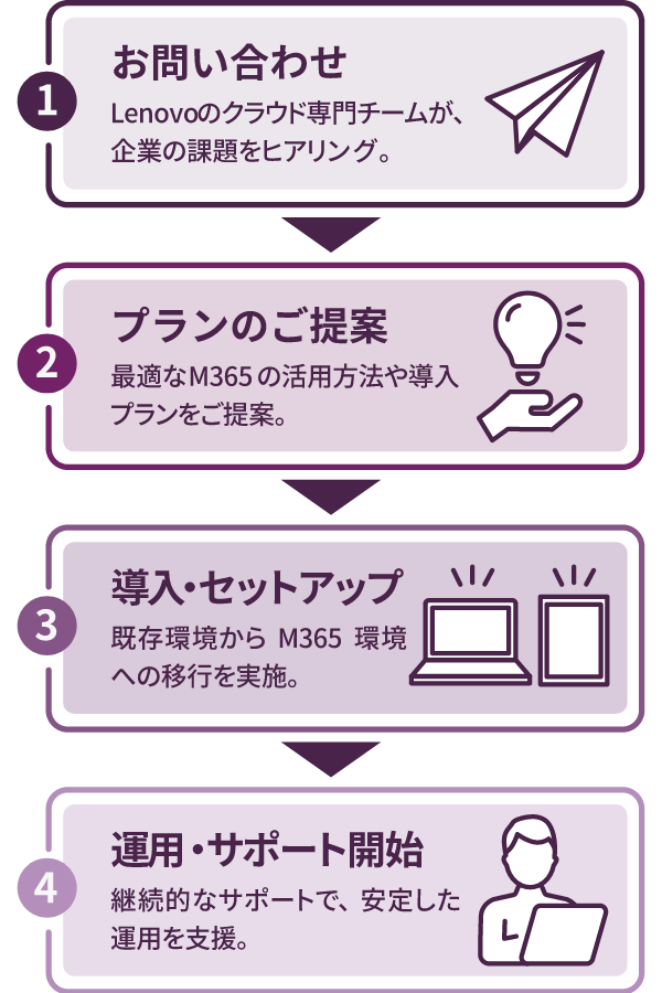 レノボのM365関連ソリューションなら、M365の導入、運用サポートに対応。管理部門の負担を減らし、M365のパフォーマンスと利便性を最大限に引き出します。